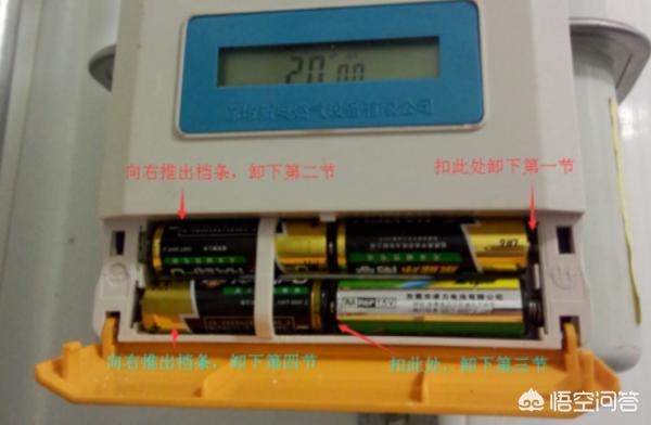 燃气表蓝色按钮怎么换电池?换电池之前,首先需要将燃气阀门关闭,燃气表表面有一个黄色的粘纸,能够看到提醒,这里就是安装电池的盖子。直接打开盖子,左边有一个小孔,里面安装的是4个电。,先要取出左上或者右上的第1个电池,然后依次将其他的3个电池一一取出。